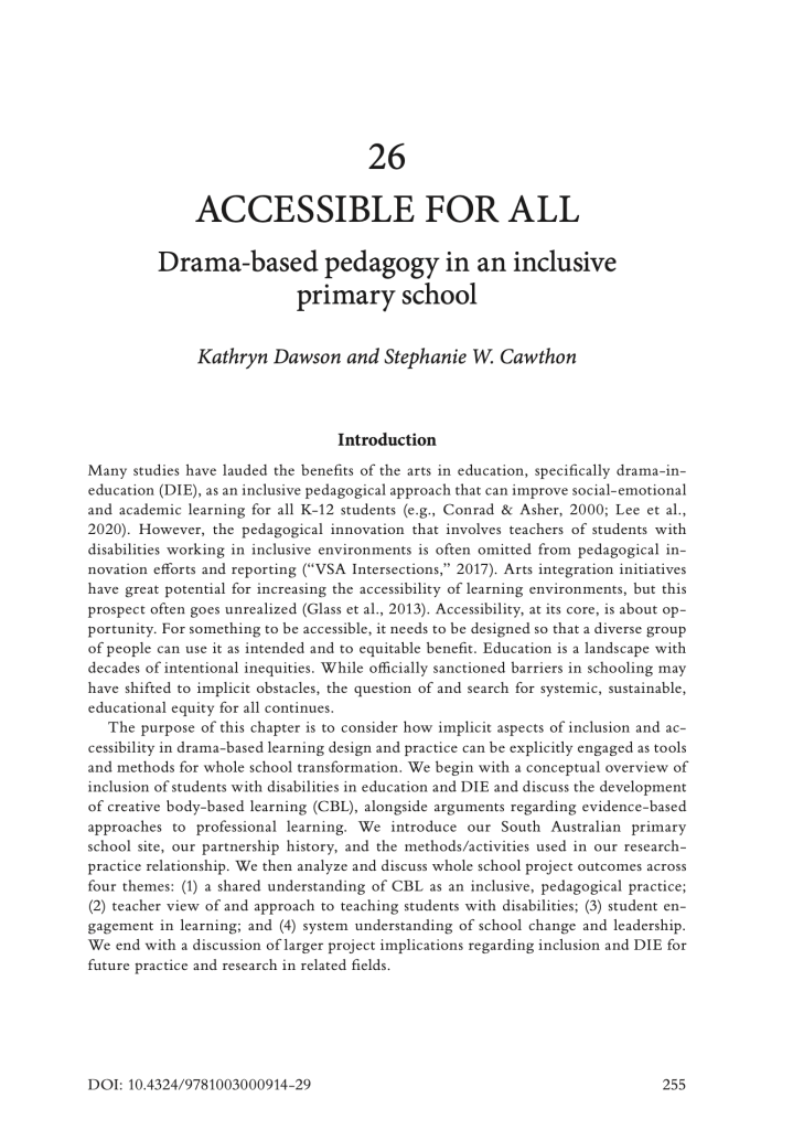 This co-authored book chapter in The Routledge Companion to Drama in Education, edited by Mary McAvoy and Peter O’Conner, works to fill a gap in the under-theorized area of inclusive drama-based learning design and practice. Disability scholar and educational psychologist Stephanie Cawthon and I supported administrators and teachers at an inclusive school in South Australia to adopt a whole-school Creative Body-based Learning (CBL) teaching method—a multi-arts expansion of drama-based pedagogy. Funded by South Australia’s Department for Education, our year-long research project supported teachers to develop new curriculum, and a series of measures for teachers to track shifts in their understanding of CBL as an inclusive, pedagogical practice. Our project was designed to support every member of the school community. It was the first time educators and students from the school’s disability unit (with students with one or more verified disabilities) and from the “main” school were able to partner together to improve education at the school.